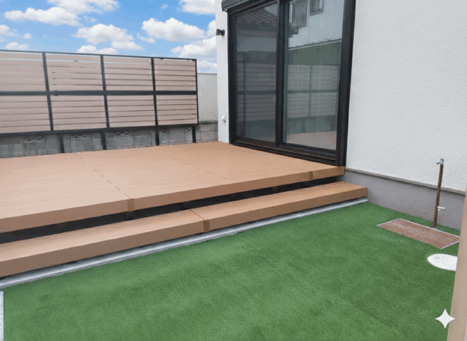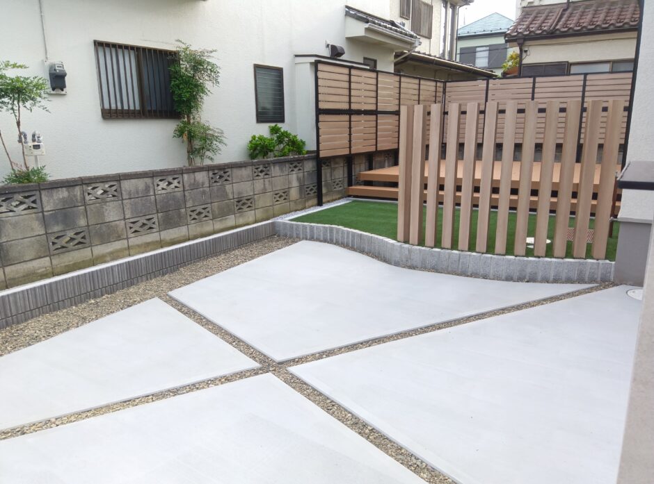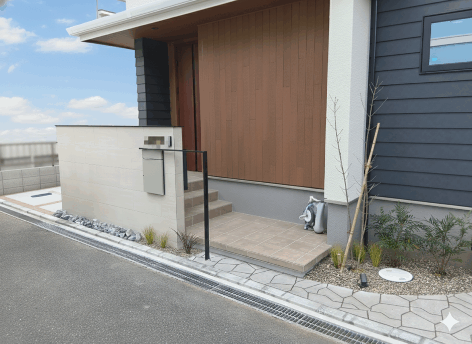 | 施工内容 | 門まわり(造作門柱、アプローチ、タイル階段) 駐車場(コンクリート土間、デザイン目地、カーポート準備) 庭まわり(ウッドデッキ、人工芝、デザイン土留め、植栽、照明) 境界まわり(目隠しフェンス、境界ブロック補強、砂利敷き) その他(立水栓設置) |