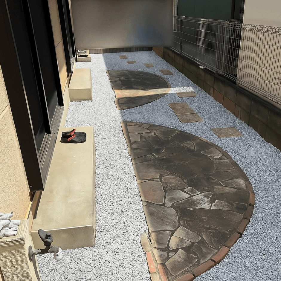 さらに、砕石エリアと他のスペースを区切るために、東洋工業の「エクレル」という縁石をご提案。空間が引き締まり、より洗練された印象になりました。