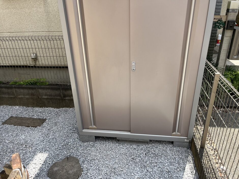 今回の工事のもう一つのポイントは、物置の移設でした。K様にとって最適な動線になるよう配置を決め、移設後には安全にお使いいただくための転倒防止工事もしっかりと行っています。