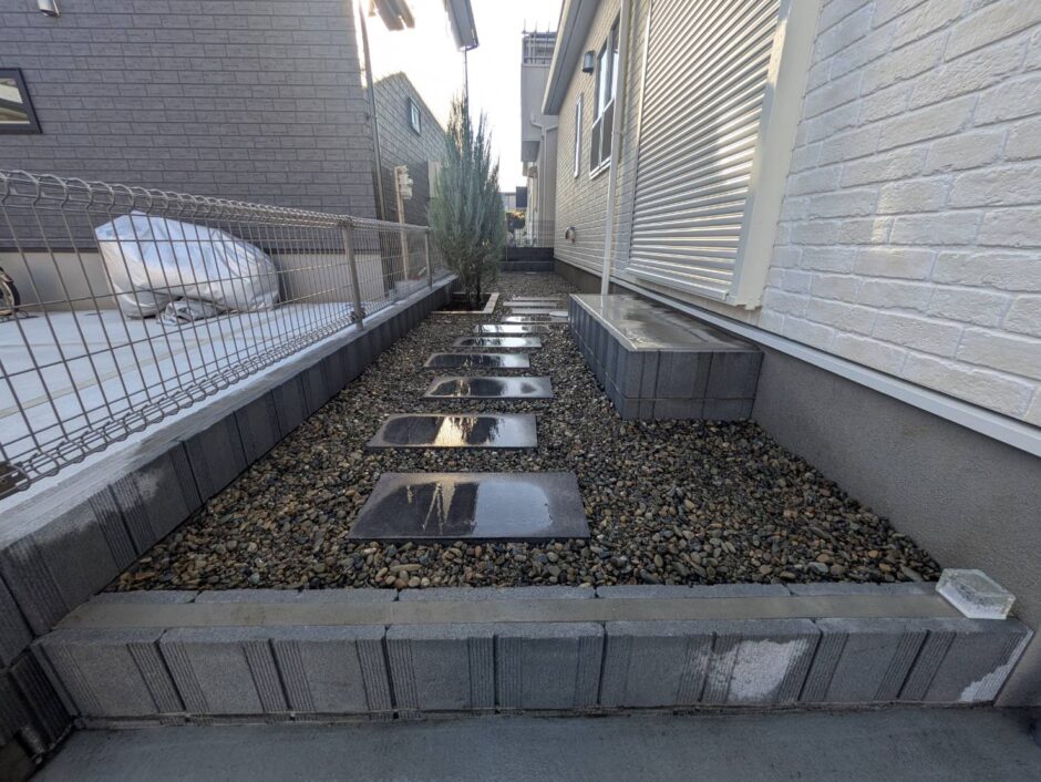 | 施工内容 | 既存植栽撤去、防草シート敷き、砂利敷き、レンガ囲い、ステップストーン設置 |