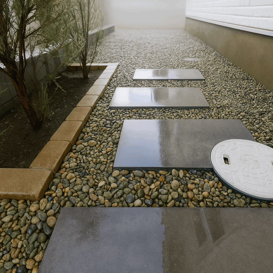そこで私たちがご提案したのが、花壇の予定だったスペースも含め、お庭全体に高品質な防草シートと明るい色の砂利を敷き詰めるプランです。これにより、最大の課題であった雑草対策はもちろんのこと、水はけが良く虫が寄り付きにくい環境を実現。見た目の美しさと機能性を両立させる、ローメンテナンスなお庭をご提案いたしました。